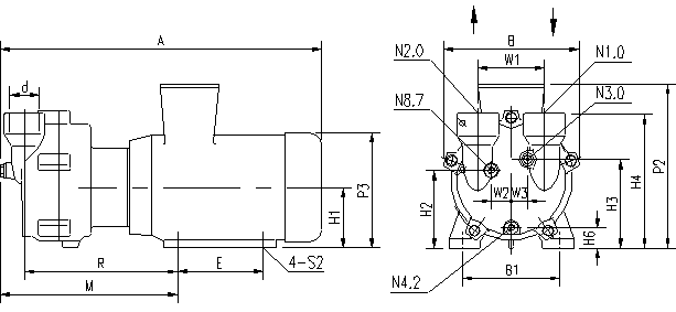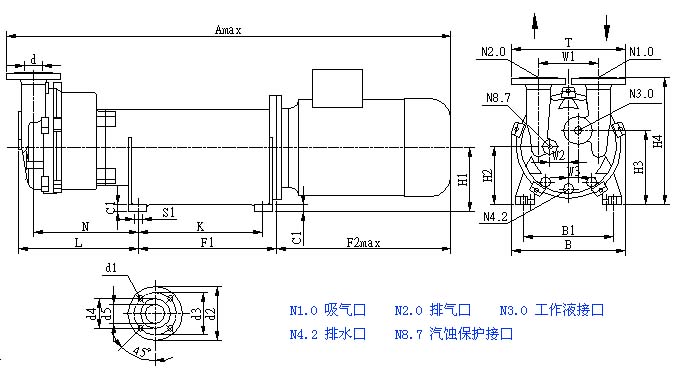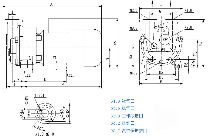 N1.0 吸气口 N2.0 排气口 N3.0 工作液接口 N4.2 排水口 N8.7 汽蚀保护接口 |